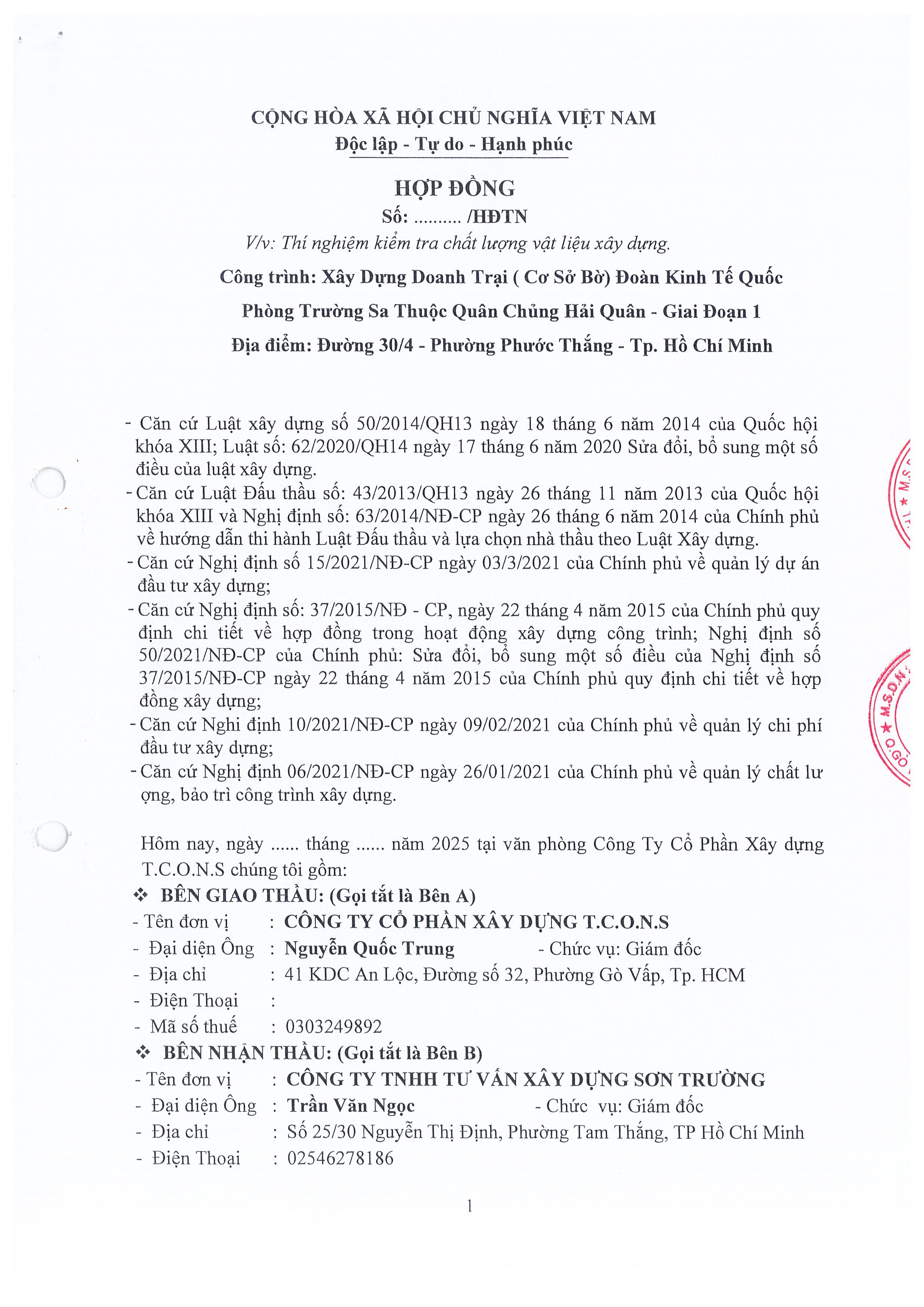 Trang chủ » Xây dựng Doanh Trại (Cơ Sở Bờ) Đoàn Kinh Tế Quốc Phòng Trường Sa Thuộc Quân Chủng Hải Quân – Giai Đoạn 1 Xây dựng Doanh Trại (Cơ Sở Bờ) Đoàn Kinh Tế Quốc Phòng Trường Sa Thuộc Quân Chủng Hải Quân – Giai Đoạn 1 Địa chỉ: Đường 30/4 - Phường Phước Thắng - Tp. Hồ Chí Minh Thời gian: 01/01/1970 Nội dung hợp đồng